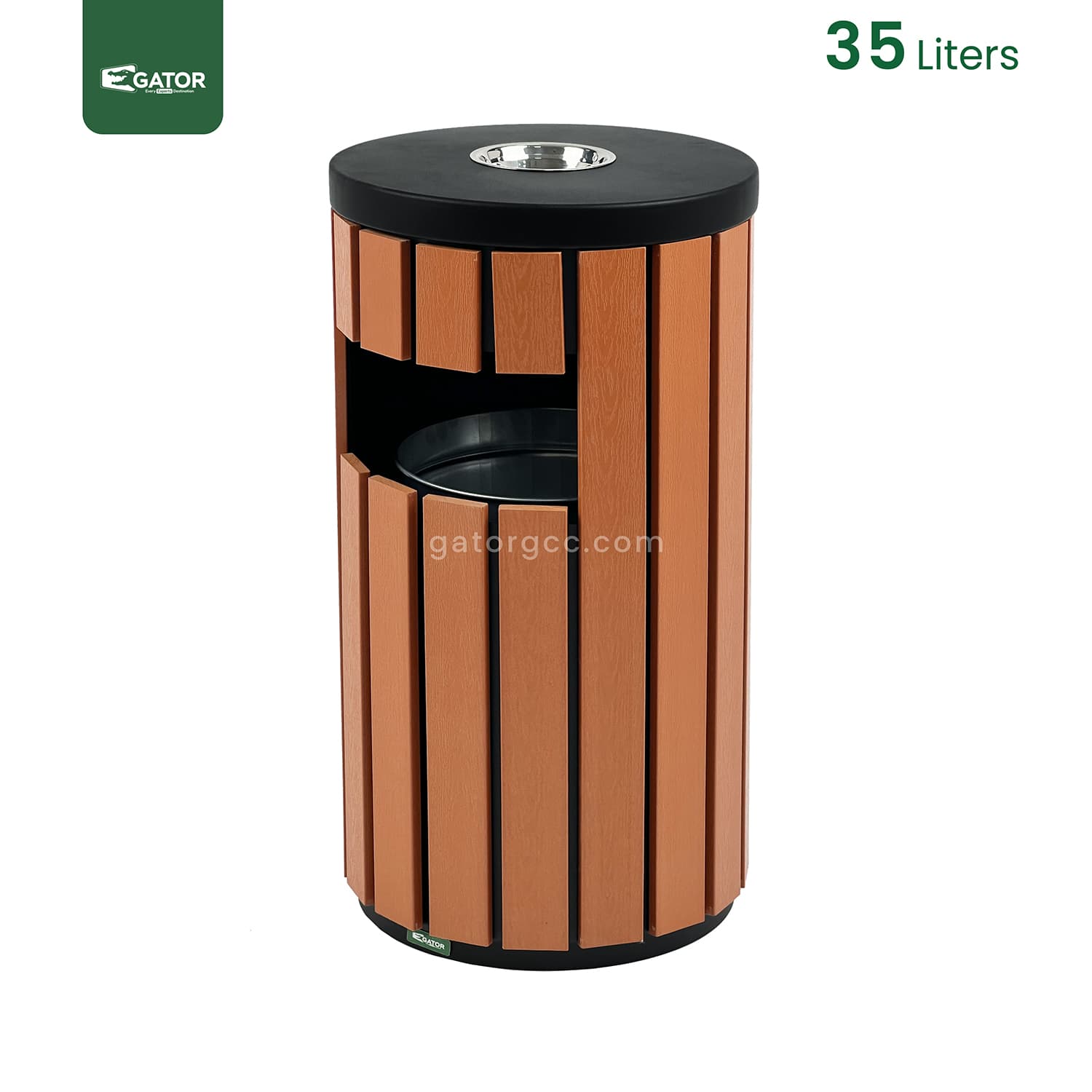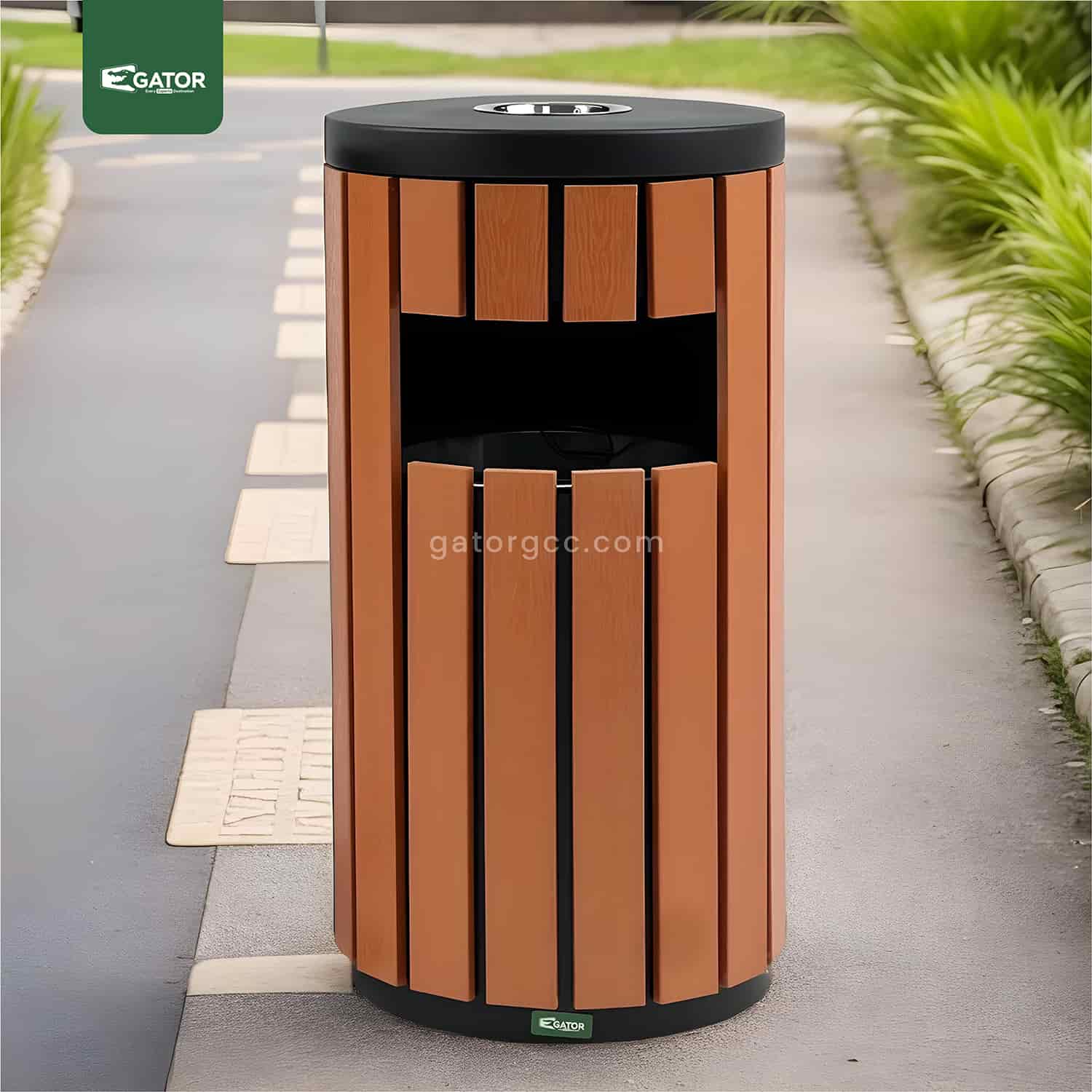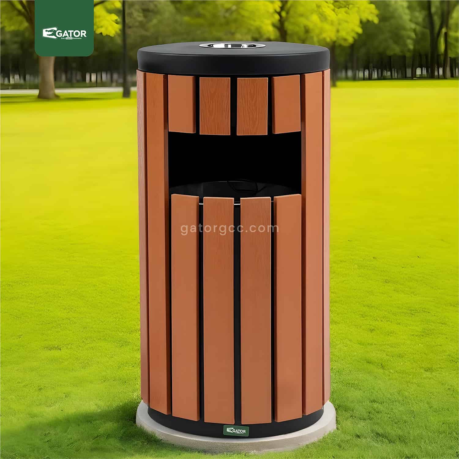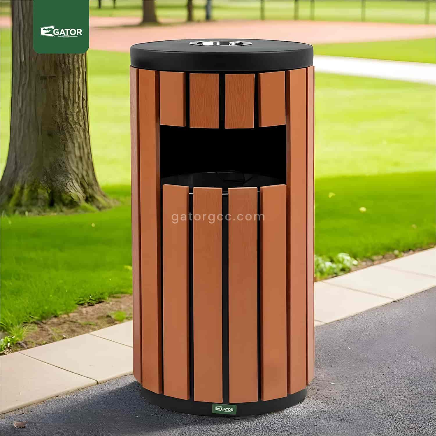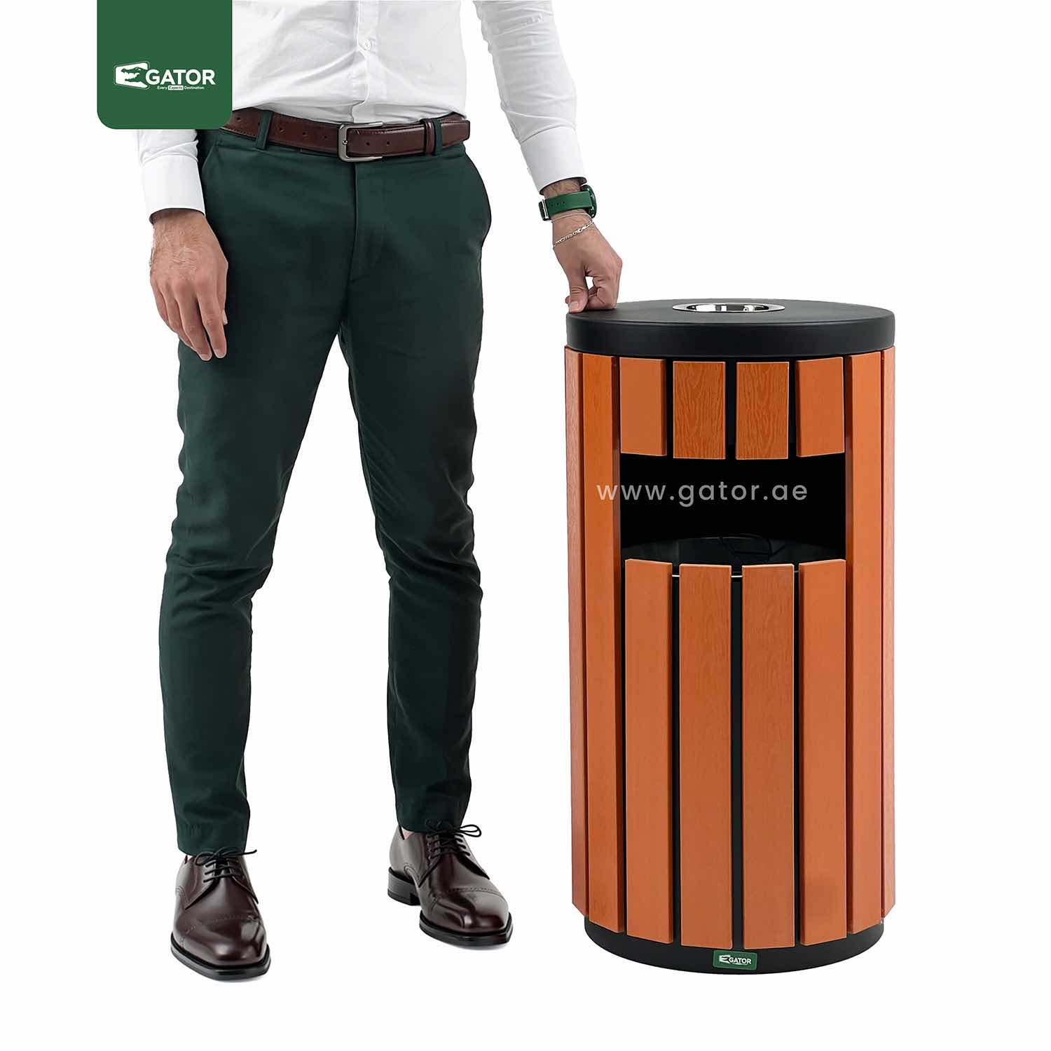 Modern round waste bin with integrated ashtray featuring vertical wood-effect panels. Combines elegant design with practical functionality. Weather-resistant construction with secure cigarette disposal section and spacious waste compartment. Specifications: Capacity: 35 Liters Dimensions: 40W × 76H × 40L Material: Metal with plastic wood panels Color: Wood Brown with black accents Style: Round with vertical slats … Read more