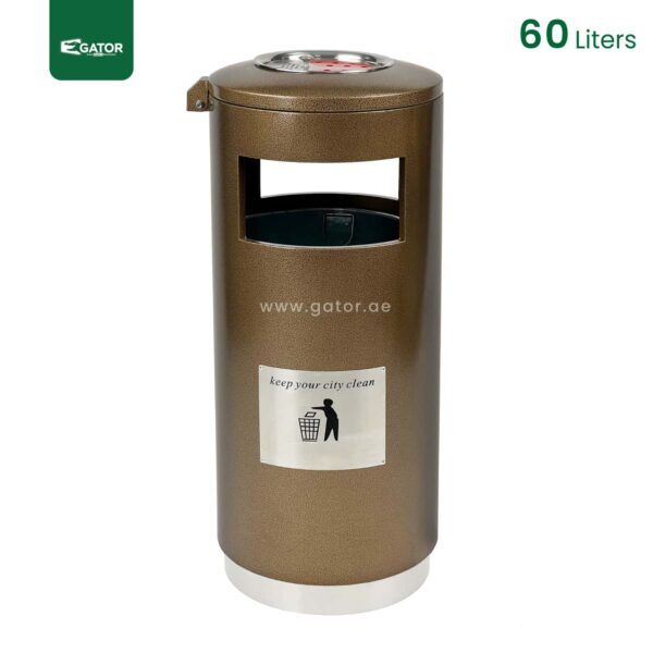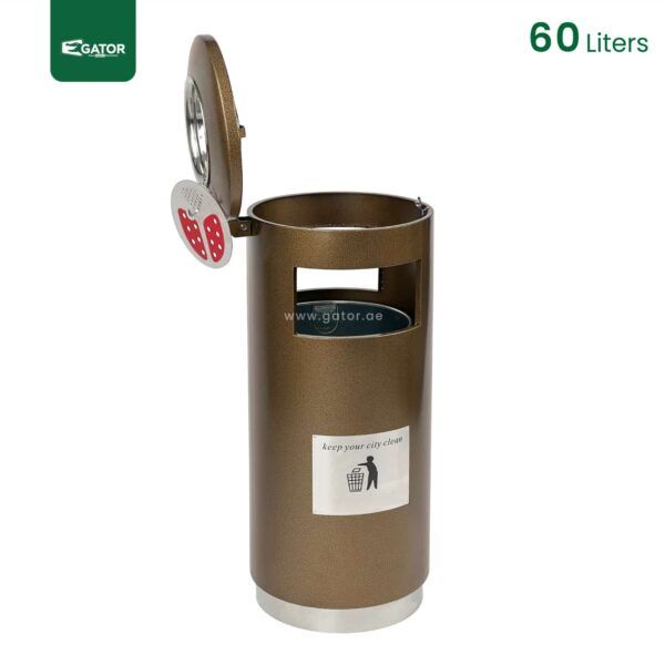 Sophisticated cylindrical outdoor bin with integrated ashtray top, featuring a 60-liter capacity stainless steel construction. The bin includes a specialized inner metal bucket and “Keep your city clean” message. Standing at 95 cm height with a 40 cm width, it offers both waste collection and smoking waste management in one elegant unit. The brown finish … Read more